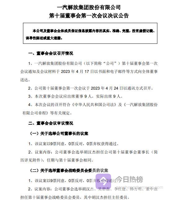 一汽解放第十届董事会第一次会议以通讯方式召开并审议通过九项议案, 标志着公司治理架构全面升级。此次换届不仅选举产生新一届董事长、各位专门委员会主任委员,还聘任了总经理及一众高管,为未来三年发展奠定人事基础。