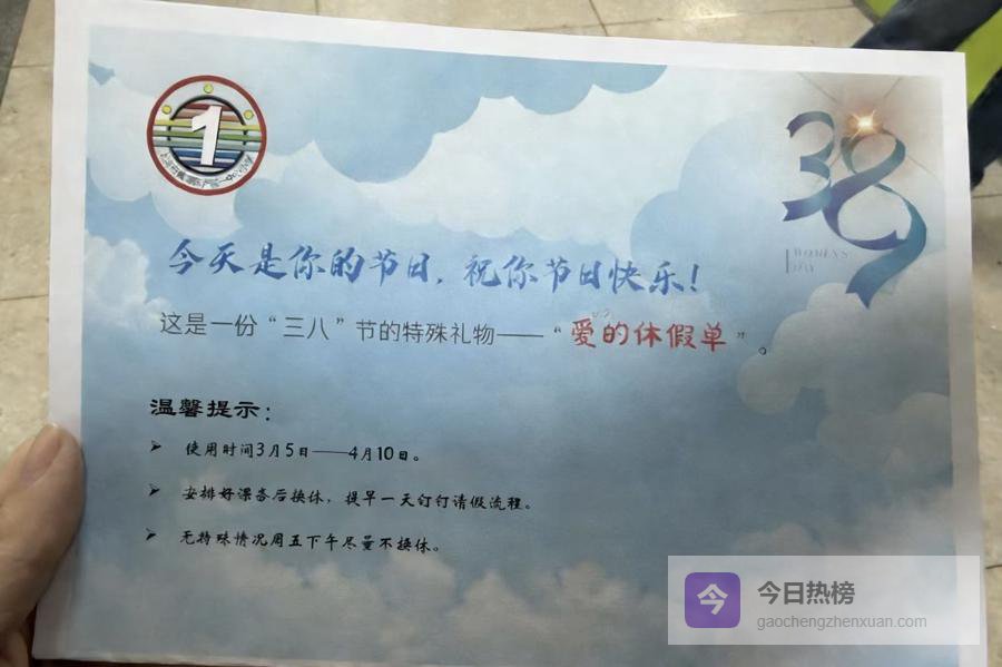 学校同时推出另一份暖心礼物——“爱的请假单”:女教师可在当天灵活调休半天,把时间留给家人。