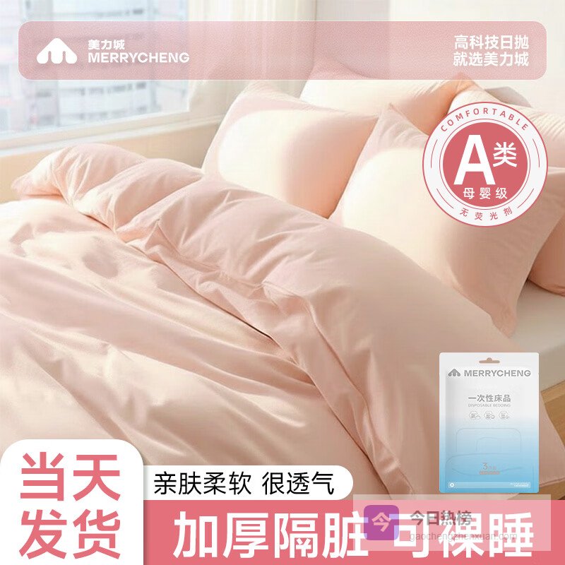 一、酒店隔脏神器:加厚一次性床品四件套住酒店最让人纠结的就是床品卫生问题。传统的解决方法要么是自带床单被罩(占行李箱一半空间),要么是硬着头皮睡(心里总膈应)。这款加厚一次性床品四件套完美解决了这个痛点——