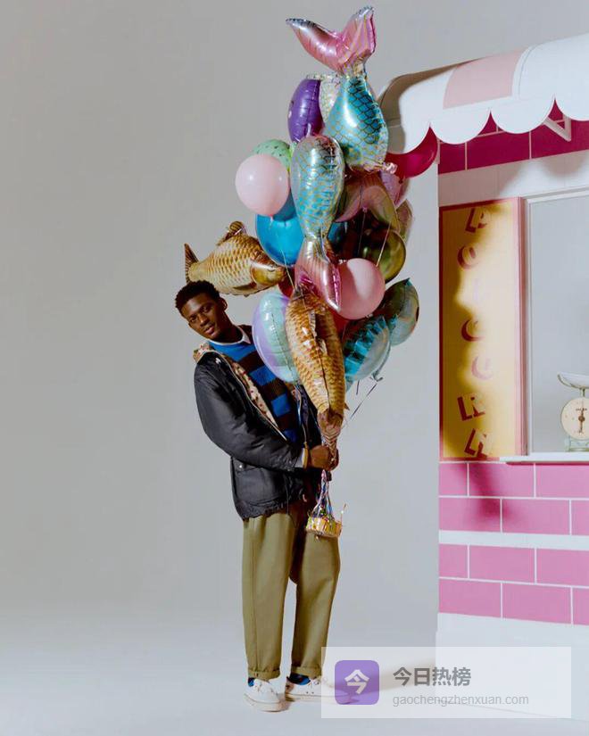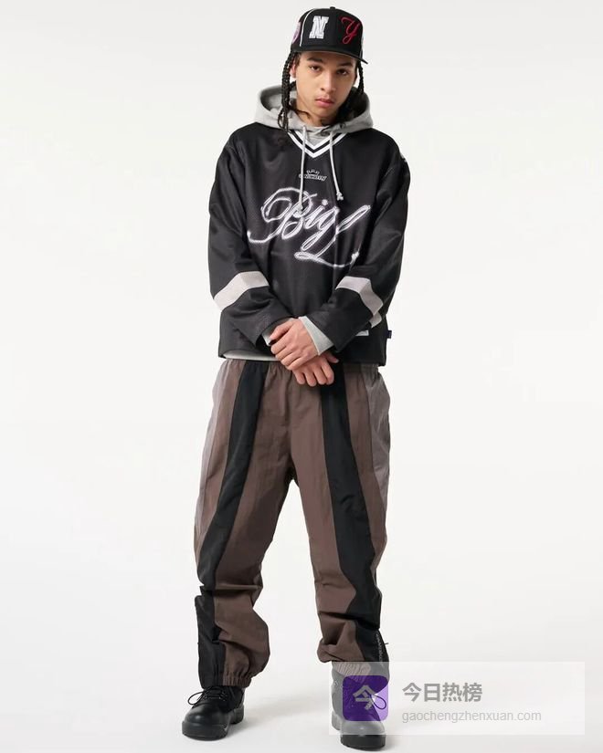服饰单品同样充满玩味:肩部带号码元素的粉色 Polo 衫灵感源自美式橄榄球服,绿松石色曲棍球球衣正面印有巨大 “NY” 标识,背面拼接 Logo。下装涵盖复古拼色印花长裤、双膝细节设计款及靛蓝与黑色牛仔裤等基础单品。