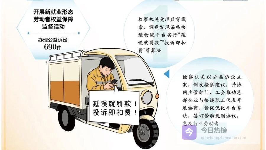 最高检工作报告显示,去年全国检察机关开展新就业形态劳动者权益保障监督活动,办理公益诉讼690件。去年3月,上海检察机关受理监督线索,调查发现某些快递物流平台实行“延误就罚款”“投诉即扣费”等算法。检察机关以公益诉讼立案,制发检察建议,并协同主管部门、工会推动总部企业与快递职工代表开展协商,督促优化平台算法,签订劳动规则协议,惠及行业劳动者。