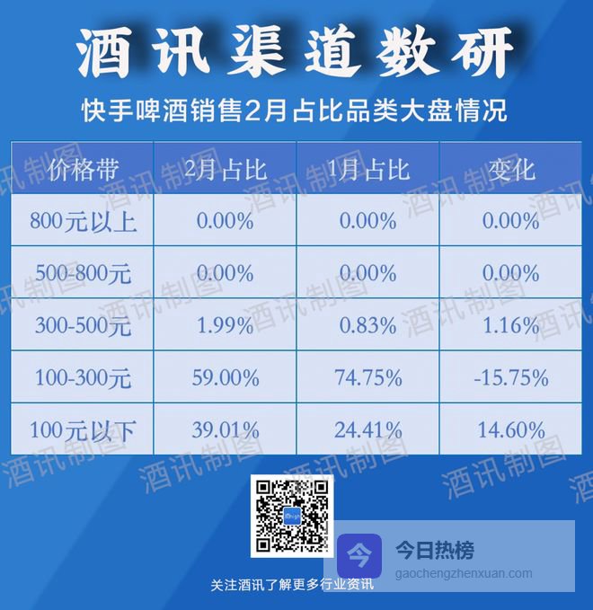 不过,在单品爆款的另一面,啤酒品类的整体客单价却在回调。数据显示,2月快手啤酒销售中,300-500元、100-300元、100元以下各价位带啤酒销售分别占品类1.99%、59.00%、39.01%。其中,100-300元价位带占比下降15.75个百分点,而100元以下价位带则上涨14.60个百分点。可见,随着春节礼赠需求的释放完毕,啤酒消费正在回归日常自饮的基本盘。