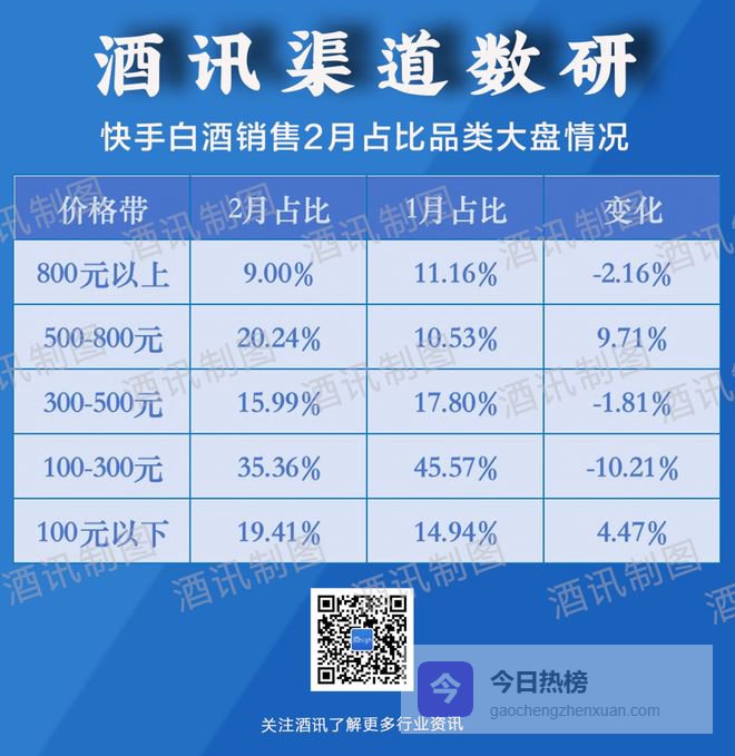 与1月相比,2月500-800元价位带白酒销售大幅上涨9.71个百分点,除此之外,100元以下价位带也有4.47个百分点的上涨;而100-300元价位带占比则下滑10.21个百分点。