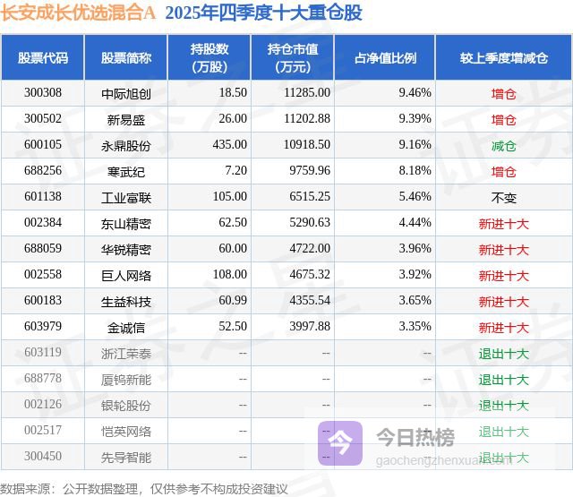 根据2025基金年报公募基金重仓股数据,重仓该股的公募基金共7家,其中持有数量最多的公募基金为长安基金的长安成长优选混合A。长安成长优选混合A目前规模为10.22亿元,最新净值0.7911(3月10日),较上一交易日上涨4.27%,近一年上涨18.13%。该公募基金现任基金经理为徐小勇。徐小勇在任的基金产品包括:长安裕隆混合A,管理时间为2018年9月7日至今,期间收益率为201.17%;长安鑫盈混合A,管理时间为2019年7月18日至今,期间收益率为100.6%;长安先进制造混合A,管理时间为2021年10月28日至今,期间收益率为-17.31%。