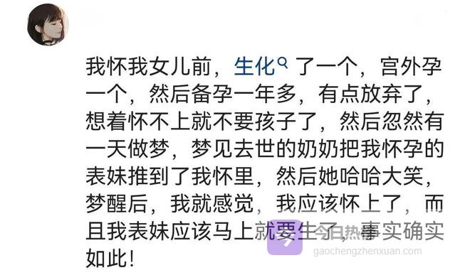 我怀儿子时梦见满树果子,我伸手摘了一颗,后面老人都说梦见摘果子是怀儿子,梦见花儿是女儿。隔了几年我又梦见很多,一大片那种,醒了就跟老公说肯定怀孕了,一测果然是怀了,后面果然生了个女儿。