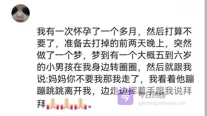准备要二胎时,我嫌压力太大了,就和我老公商量不要了,晚上就做梦梦见我儿子,是高中生模样,瘦高,三七分的头型 一身红色校服,背了一个双肩包,告诉我,妈妈你要把我生下来,我很听话,比姐姐听话,让你少操心,老二五岁了,虽然有熊脾气,但是确实是一个天使宝宝,好商议事儿还少