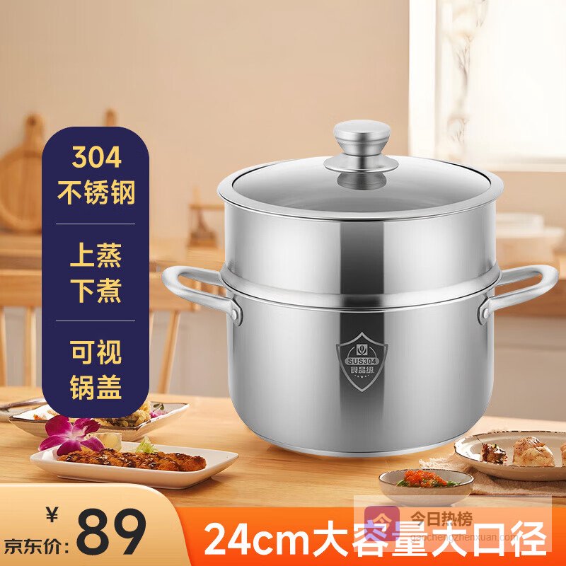 【京东自营】国风304不锈钢复底带蒸格汤锅24cm蒸煮炖一锅多用防烫手柄煤气电磁炉¥