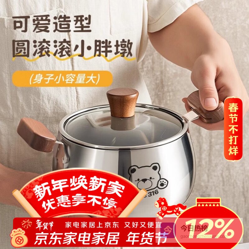 【品牌直营】国风316不锈钢小汤锅家用迷你炖锅加厚煮锅燃气电磁炉用宝宝辅食小锅【抗菌316】双耳汤锅¥