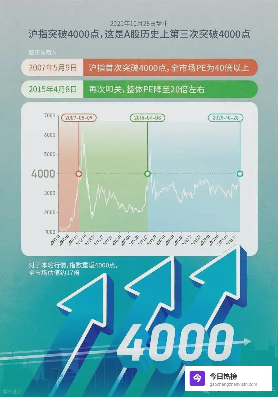 2025年10月28日,中国A股2.4亿的股民群体(截至 2025年10月,A 股投资者总量已突破 2.4 亿户,以全国14.08亿人口为基数计算,股民占比约 17%,恰好对应 “每 6 人有 1 位投资者” 的比例。),迎来了时隔10年才再次出现的市场高点:4000点。