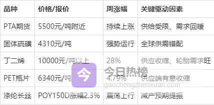 国内外价格表现:2026年1月下旬,塑料化工品市场迎来普涨行情。PX、PTA延续强势上涨态势,PTA期货主力合约逼近5500元/吨,创下阶段新高。硫磺价格在华东地区(镇江港)固体硫磺报价达4310元/吨,丁二烯华东地区价格突破1万元/吨,较2025年12月底上涨2400元/吨,涨幅约28%。纯苯市场依托多重利好全线强势上行,PC市场坚挺运行,涤纶长丝震荡上扬,PET瓶片现货均价收于6340元/吨,周涨幅达4.79%。这种全面上涨格局主要受益于供给端“反内卷”政策持续推进、落后产能加速出清,以及海内外需求共振回暖的多重利好。