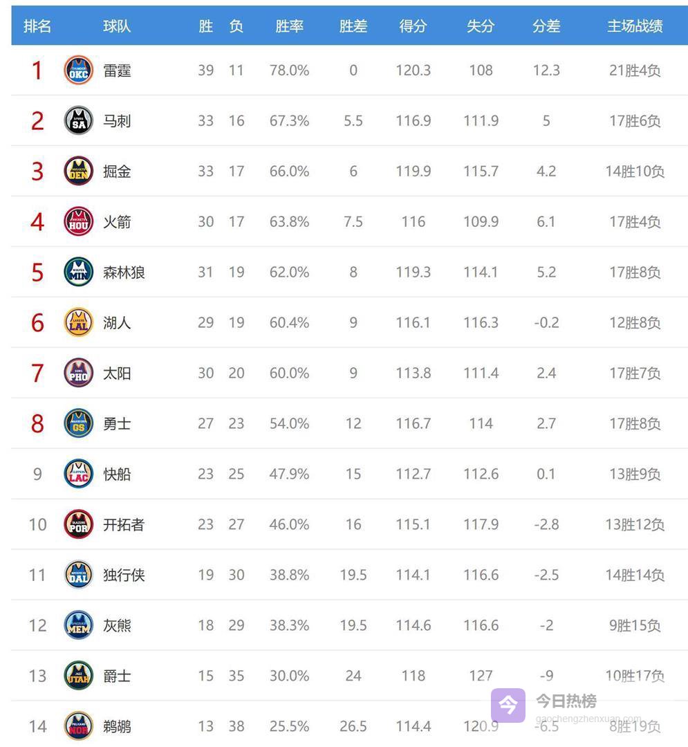 一天的激战过后,西部的版图发生了变化。 俄克拉荷马雷霆以39胜11负的联盟第一战绩,依然稳坐钓鱼台。 圣安东尼奥马刺和丹佛掘金互换了第二和第三的位置。 休斯顿火箭坐收渔利,巩固了第四的排名。