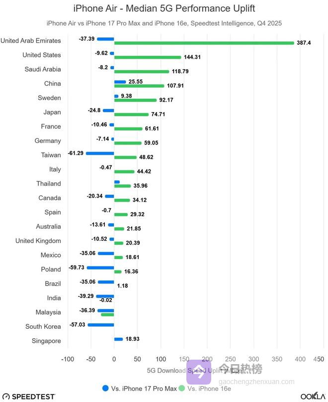在上传速度方面,Ookla 表示:“相较于搭载 X80 的 iPhone 17 Pro Max,C1X 实现了更均衡的上传体验,多数市场的上传速度差值在 ±5Mbps 以内,仅中国台湾地区(-8.6Mbps)、马来西亚( 5.6Mbps)、印度(-5.2Mbps)、波兰(-7.3Mbps)和阿联酋(-9.2Mbps)除外。”