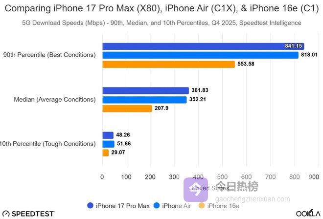 而 Ookla 的结论更是对苹果 C1X 给出了有力认可:在时延表现上,C1X 明显领先高通 X80 基带。在实时生成式 AI 与云计算领域,时延正成为一项关键指标。该机构称:“C1X 基带相较 C1 基带,网络响应速度持续提升,在中国(领先 6ms)、印度尼西亚(领先 6ms)和美国(领先 5ms)的表现尤为突出。除中国台湾地区和日本外,C1X 在绝大多数市场的时延表现均优于 iPhone 17 Pro Max。”