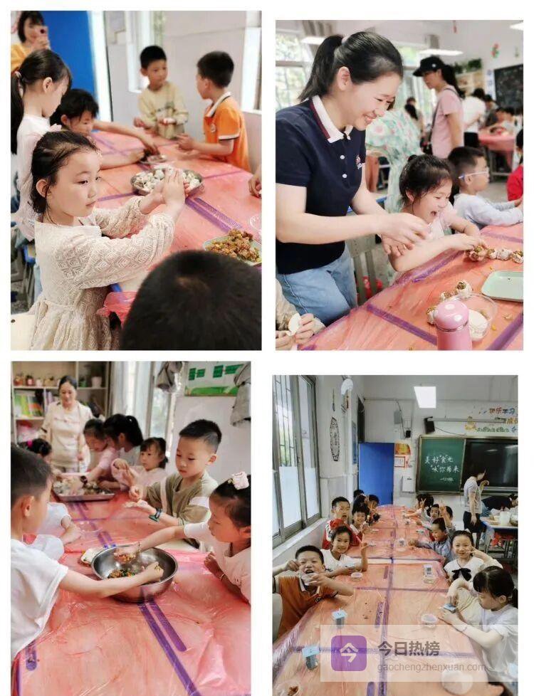 一3班把主题定为“美好食光”,桌子拼成U形长桌宴:腊肉粽子、寿司、薯条、鸡爪、布丁、西瓜、艾米果、哈密瓜……色彩与香气交织成一张巨大的“味觉网”。特殊嘉宾陈锦鑫妈妈登场,她先科普烧卖的由来,再示范“虎口收拢、拇指一捏”的关键动作。孩子们的小手忙得团团转:有人一次成型,有人反复拆线,却笑得比阳光还灿烂。
