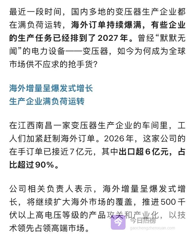 数据显示,我国变压器行业企业约3000家。2025年,变压器出口总值达646亿元,比2024年增长近36%。我国已成为世界第一大变压器生产国,在原材料、成本、生产周期等方面都具备明显优势。