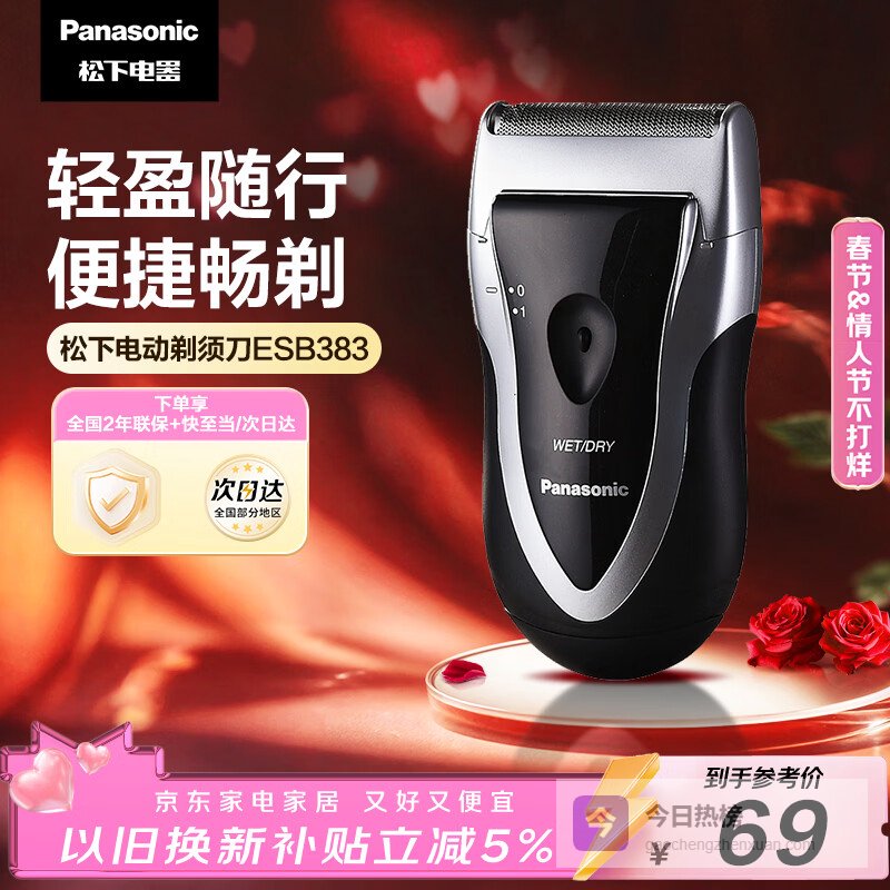 松下(Panasonic)电动剃须刀往复式男士电动刮胡刀进口单刀头全身水洗长续航生日礼物情人节礼物送男生B383干湿双剃¥