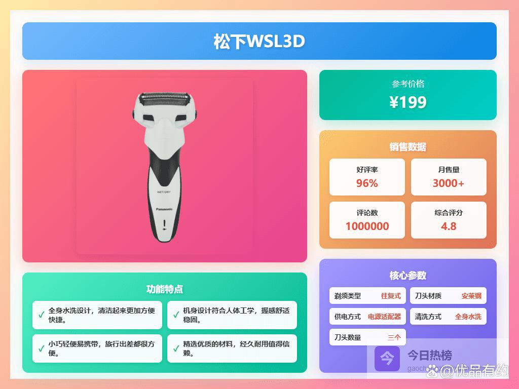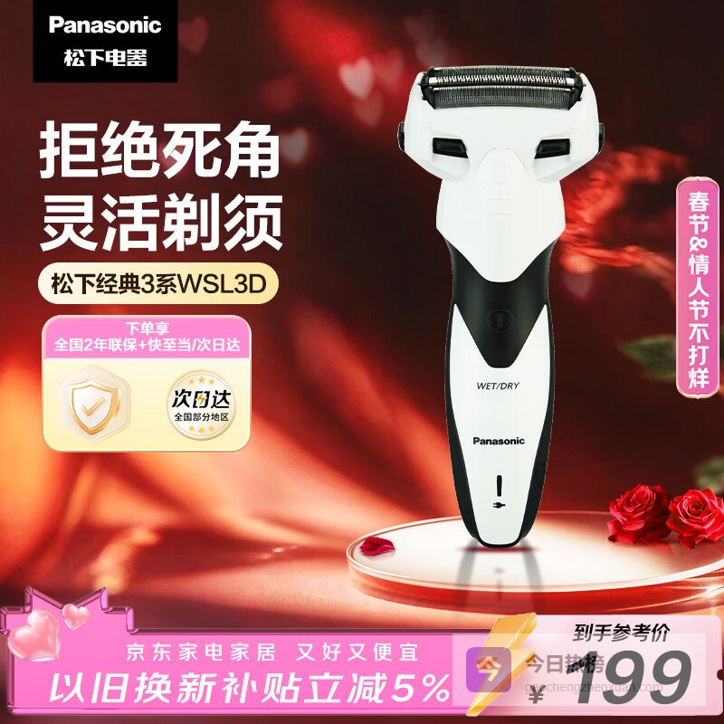 4、松下WSL3D这款松下ES-WSL3D剃须刀配备了三刀头系统,采用进口安莱钢材质,不仅确保刀片锋利耐用,还能实现干湿双剃,满足不同剃须需求。其浮动刀头设计,贴合面部轮廓,即使是难剃的区域也能轻松应对,保证剃得干净顺滑。而且,机身采用全身水洗设计,清洁起来非常方便,只需用水冲洗即可,无需繁琐拆卸。