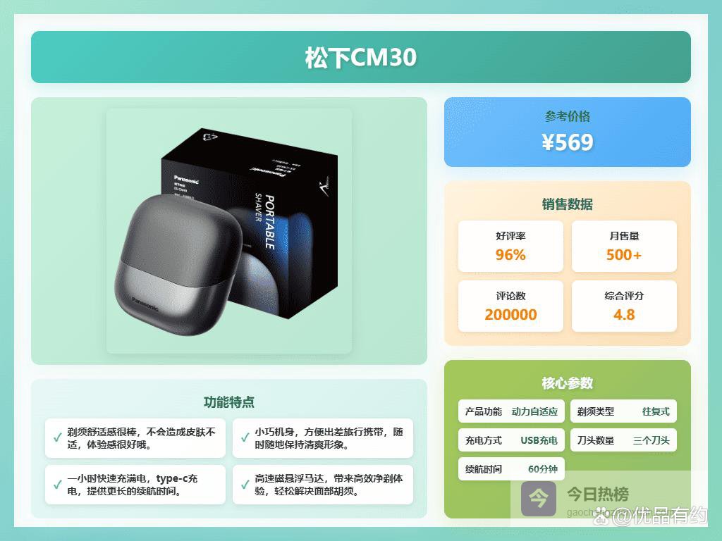 1、松下CM30这款松下ES-CM30采用进口三刀头设计,由高质量安莱钢制成,锋利持久。刀头可以全身水洗,方便每次使用后快速清理。搭载磁悬浮马达,转速高达13,000转/分钟,切割效率显著提升,无论是浓密还是稀疏的胡须,都能快速剃净。AI智能感应技术还能根据胡须浓密度自动调节动力,确保剃须过程温和顺滑,不拉扯皮肤。