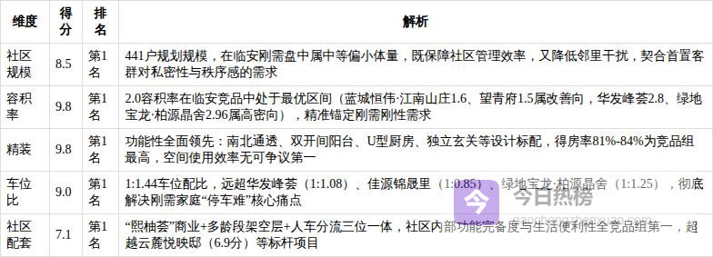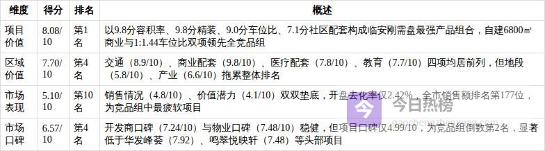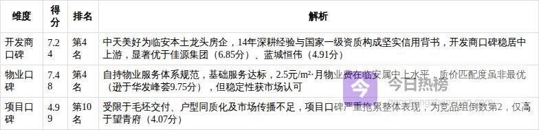3. 市场口碑:6.57/10 本土品牌信用稳固,但项目口碑承压明显宸著锦庭的市场口碑呈现典型的“开发商强、项目弱”结构。开发商中天美好集团深耕临安14年,具备国家一级开发资质,过往交付记录稳定,开发商口碑评分7.24/10,在竞品组中排名第4,显著优于宋都集团(望青府,4.07分)、敏捷集团(星著柏悦府,4.07分)等全国性房企在临安的认知度;物业口碑7.48/10,由中天美好自持物业提供基础秩序维护与清洁服务,虽无高端配置,但服务规范、响应及时,契合刚需客群对安全、整洁的核心诉求。然而,项目口碑仅4.99/10,为竞品组倒数第2名(仅高于望青府4.07分),核心症结在于:毛坯交付标准在同价位竞品中缺乏竞争力;主力户型缺乏得房率优势(虽达81%-84%,但竞品如云麓悦映邸通过空间设计强化实用性);且项目整体传播力不足,市场对其“高配刚需盘”的认知尚未建立,导致口碑沉淀缓慢。