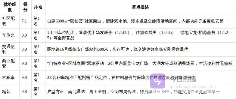 "多维PK榜"评价情况在2026年第一季度"多维PK榜"评价中,宸著锦庭在【社区配套】、【车位比】、【交通便利】、【商业配套】等维度上表现突出,以6800㎡自持商业“熙柚荟”、1:1.44车位比、距地铁16号线临安广场站约500米等硬指标,成为临安刚需盘中基础生活便利性兑现度最高的项目。