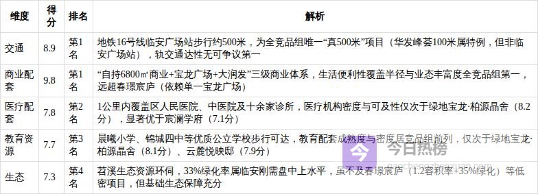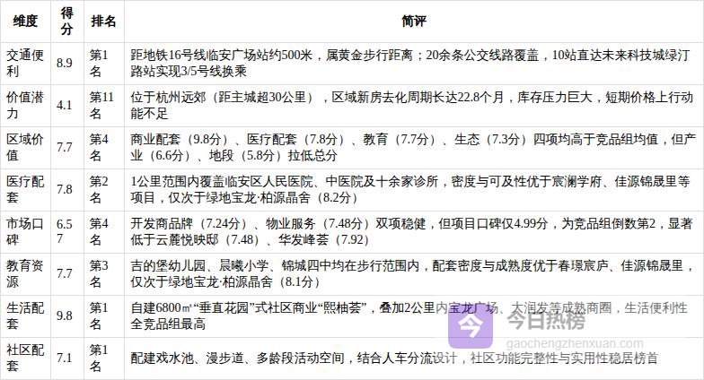 2. 区域价值:7.70/10 地铁真500米+配套高密度兑现,但长期动能受限宸著锦庭所在临安锦城板块,是杭州“第十区”融杭发展的前沿阵地,更是城西科创大走廊的重要组成部分。其区域价值的核心支撑在于“已兑现”的硬配套:距地铁16号线临安广场站约500米,属黄金步行距离,10站直达未来科技城;2公里内汇聚宝龙城市广场、大润发等成熟商圈;1公里范围内覆盖临安区人民医院、中医院及吉的堡幼儿园、晨曦小学、锦城四中等全龄段教育资源;苕溪生态资源环绕,绿化率33%具备基础生态保障。这些要素共同构成临安刚需盘中罕见的“高密度配套兑现”。然而,其短板同样清晰:地段评价仅5.78/10,为竞品组倒数第2;产业支撑力6.6/10,缺乏高附加值岗位;最关键的是,临安已明确无缘杭州地铁第五期建设规划,16号线成为唯一轨交通道,长期通勤便利性提升存在天花板,制约区域价值跃升。