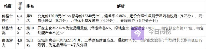 4. 市场表现:5.10/10 去化持续低迷,价格合理性与价值潜力双低宸著锦庭的市场表现是其最大短板,综合得分5.10/10,在11个竞品中排名第10名,几乎垫底。销售情况评价仅4.75/10,开盘去化率低至2.42%,近一年杭州全市商品住宅销售额排名第177位;价值潜力评价4.07/10,为竞品组最低分,反映市场对其长期升值预期极低;价格合理性评价6.47/10,虽非最差(华发峰荟仅4.07分),但公允建议价(12019元/m²)较官方指导价(13340元/m²)低逾10%,印证定价与市场接受度存在显著错配。根本原因在于:作为郊区刚需盘,其13340元/m²均价虽低于杭州主城,却远高于区域内“笋盘”蓝城恒伟·江南山庄(7060元/m²),在高库存(去化周期22.8个月)、弱需求的临安市场中,缺乏足够价格吸引力;同时,项目缺乏能引发跨区购买力的稀缺资源(如名校分校、三甲医院、产业高地),难以突破地缘客群局限。