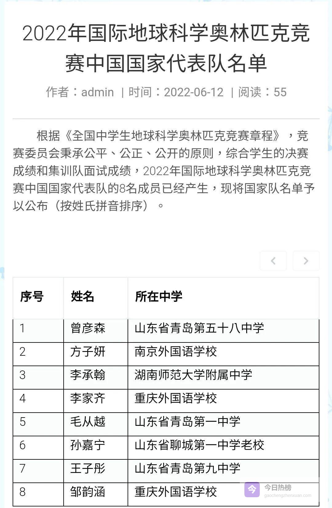 国际地球科学奥林匹克竞赛国家队名单