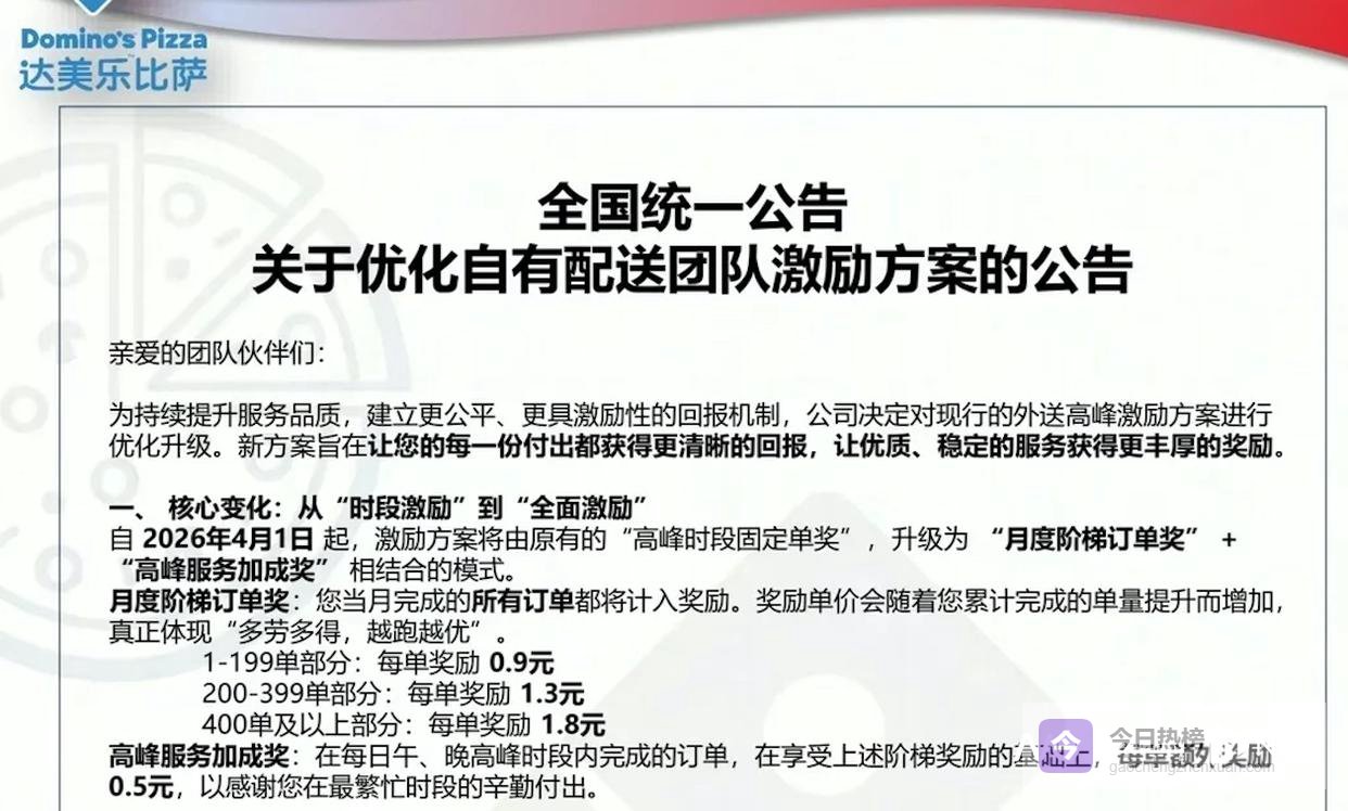 对于调整原因,达美乐在公告中指出,为感谢伙伴们全天的付出而不仅是简单的忙碌,公司优化了激励结构。新方案让全天每笔订单都有价值,且跑得越多、奖励单价越高,旨在更公平、更快地回报稳定、优质的配送服务。达美乐称,新方案的设计目标并非降低骑手收入,而是优化激励结构。对于提供稳定、优质服务的骑手,总收入将更有保障。
