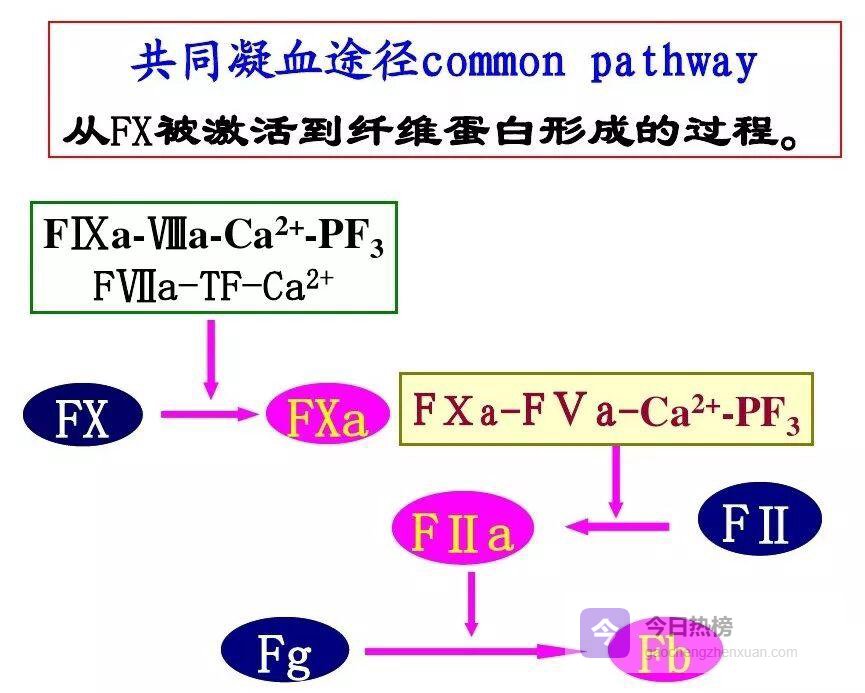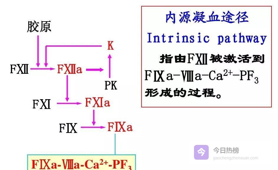 4.1 ❒ 内源性途径(12a→10a)带负电的损伤面激活Ⅻ→Ⅻa→Ⅺa→Ⅸa→Ⅹa,形成血浆凝血活酶,最终把纤维蛋白原变成纤维蛋白。临床用 APTT 当筛子,一测就知内源系统是否“掉线”。