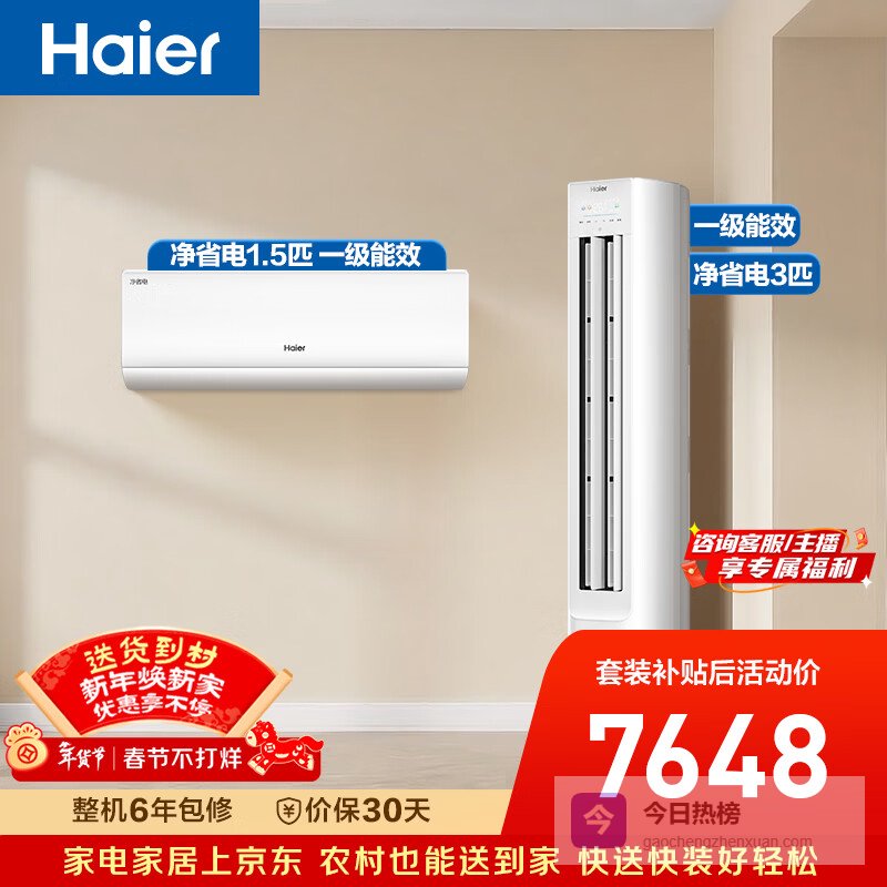【京东自营】海尔净省电空调套装小红花套系AI节能大1.5匹挂机大3匹柜机新一级变频冷暖一室一厅以旧换¥