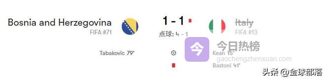 1-1 战平,点球落败,意大利足球再迎至暗时刻。在泽尼察的比利诺波尔耶球场,蓝衣军团不敌波黑,连续第三届世界杯无缘决赛圈,你敢信,世界排名第13输给了世界排名第71【非愚人节玩笑】,曾经的四星意大利彻底陷入低谷;而波黑则用一场铁血胜利,时隔 12 年再度踏上世界杯舞台。