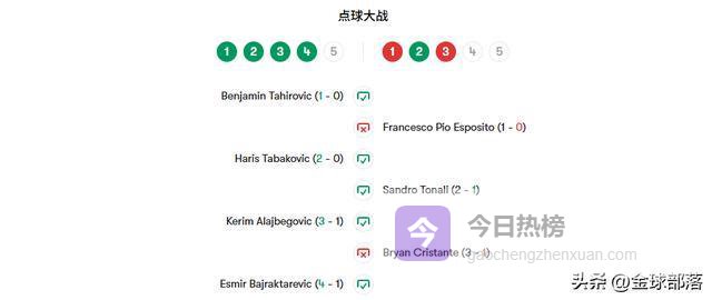 加时赛末段塔希罗维奇低射偏出,比赛进入点球大战。埃斯波西托罚丢意大利首罚,波黑前三罚全部命中;接着布莱恩・克里斯坦特则将点球击中横梁。最终埃斯米尔・巴伊拉卡雷维奇的点球从多纳鲁马身下滚入球门,波黑举国狂欢,时隔 12 年重返世界杯,意大利球员则黯然神伤。