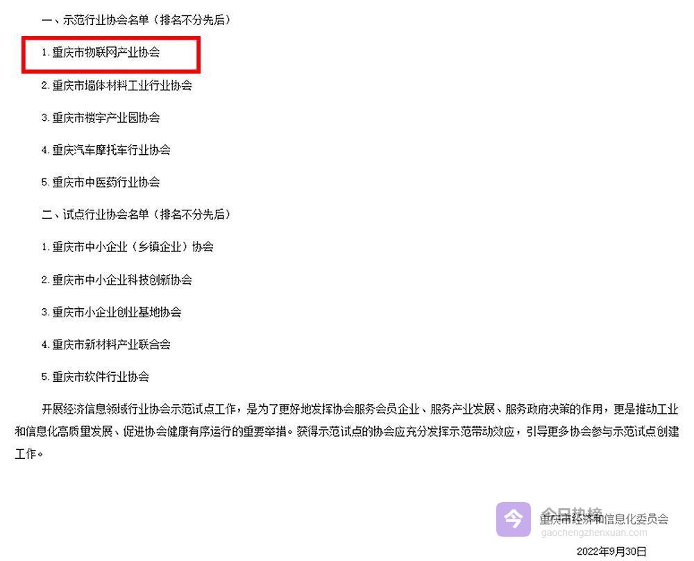 重庆市经济和信息化委员会最新公布的2022年度经济信息领域示范试点行业协会创建名单中,重庆市物联网产业协会榜上有名。这份名单的诞生,历经协会自愿申报、部门初审、专家评审、现场核查、网上公示五大环节,最终从众多申报主体中脱颖而出,为重庆物联网行业再添一张“金名片”。