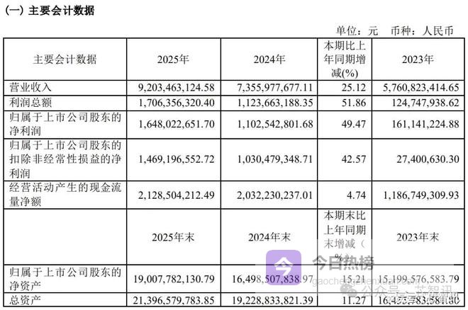 根据财报显示,兆易创新2025年实现营业收入92.03亿元,同比增长25.12%;归属于上市公司股东的净利润16.48亿元,同比增长49.47%;扣非后净利润14.69亿元,同比增长42.57%。公司拟向全体股东每10股派发现金股利人民币7.5元(含税)。