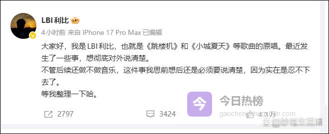 一首《跳楼机》火遍全网,海外播放量破5400万,吸金数千万,让LBI利比这个名字被无数听众熟知。他用一首首抓耳的旋律,诠释着独立音乐人的热爱与坚守,可谁能想到,在音乐光芒的背后,他竟要直面资本的步步紧逼,被逼到深夜发文:“实在忍不下去了”。