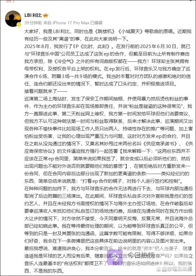 3月30日深夜,利比的一条微博,撕开了音乐行业光鲜亮丽的遮羞布。从最初的“思前想后必须说清楚”,到后续字字泣血的控诉,这位唱红《小城夏天》《跳楼机》的原创音乐人,把自己与环球音乐中国的矛盾公之于众,不惜赌上自己的音乐生涯,也要讨一个公道。这哪里是一场艺人与公司的纠纷,这分明是独立音乐人在资本面前,为自己的权益、为创作的尊严,做的最后抗争。