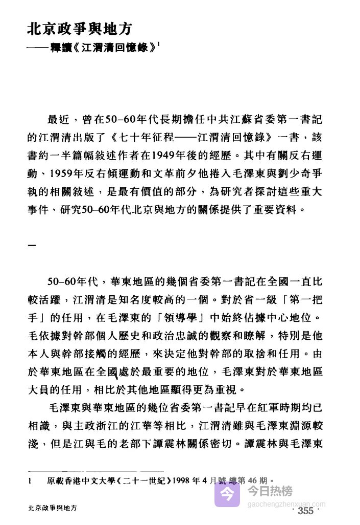 其实,作为一个历史的业余爱好者,我自然也非常清楚江渭清这本回忆录的价值是不容小觑的。但是,作为专业的历史学者高华对江渭清回忆录中相关叙述抽丝剥茧的分析,则的确让我们这些历史票友大开眼界,醍醐灌顶。