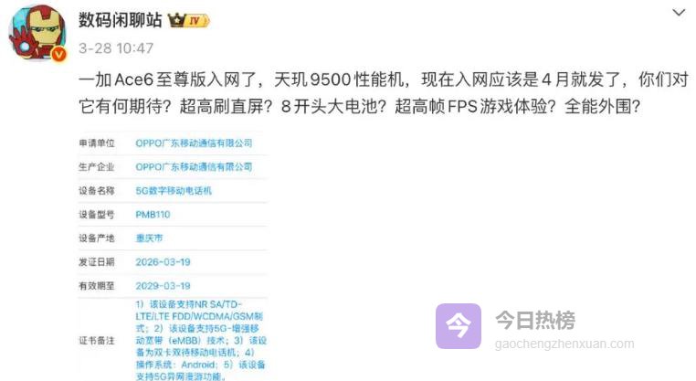 家人们,一加Ace6至尊版入网实锤,天玑9500+8500mAh大电池,4月份发布,你们觉得这波堆料够顶吗?准备冲首发吗?评论区唠唠你的看法~