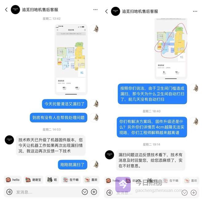 更令张先生费解的是,漏扫的区域毫无规律,且家中地面并无杂物遮挡。张先生求助社交媒体遇到同样问题的用户支招,尝试重启机器、重建地图、恢复出厂设置都没解决问题。针对这一问题,张先生多次联系追觅官方客服,对方先是怀疑问题是由于“卫生间门遮挡”,后又归咎于“过门石台阶过高”。张先生反驳称,自己购买前明确看到宣传页写着“4厘米全地形五轮越障”,而家中门槛不超过1厘米,机器既然能进出,为何会出现选择性漏扫?