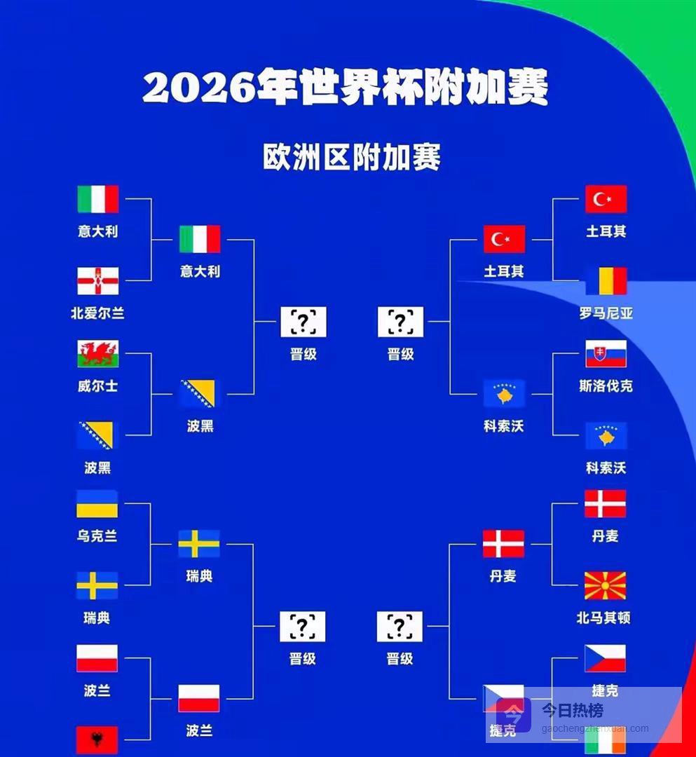这四组对阵,每一场都藏着火药味。 意大利对波黑,瑞典对波兰,土耳其对科索沃,丹麦对捷克。 这八支球队里,有曾经的冠军,有等待了二十年的老牌劲旅,有想要创造历史的黑马,还有那些把这场比赛当作职业生涯最后一搏的老将。 所有的故事,都浓缩在这一场90分钟里。