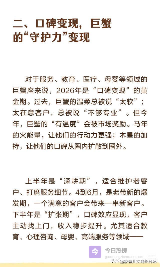 2026年,巨蟹座的事业运之所以能“拉满”,不是因为运气好,而是因为他们“守得住、暖得了、熬得起”。以前的每一次付出,每一次守护,每一次默默坚持,都在为今年的“口碑爆发”做准备。职场的巨蟹,会从执行者变成团队核心;自由职业的巨蟹,会从“有服务”变成“有品牌”。你的温柔,不再是弱点,而是你最硬的护城河;你的情绪化,不再是缺点,而是你洞察人心的天赋。