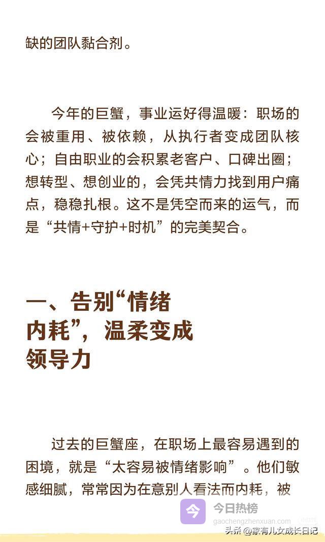 第四,控制“情绪化”:巨蟹情绪起伏大,但今年关键场合必须稳住,别因为情绪影响专业判断。