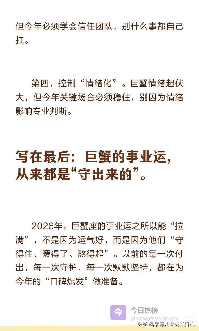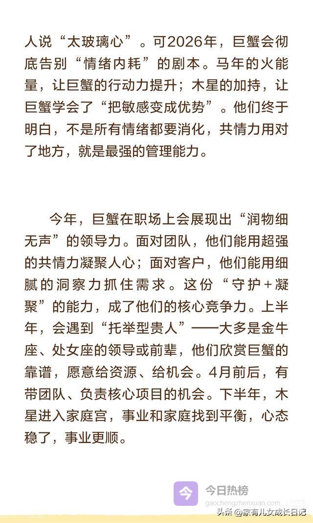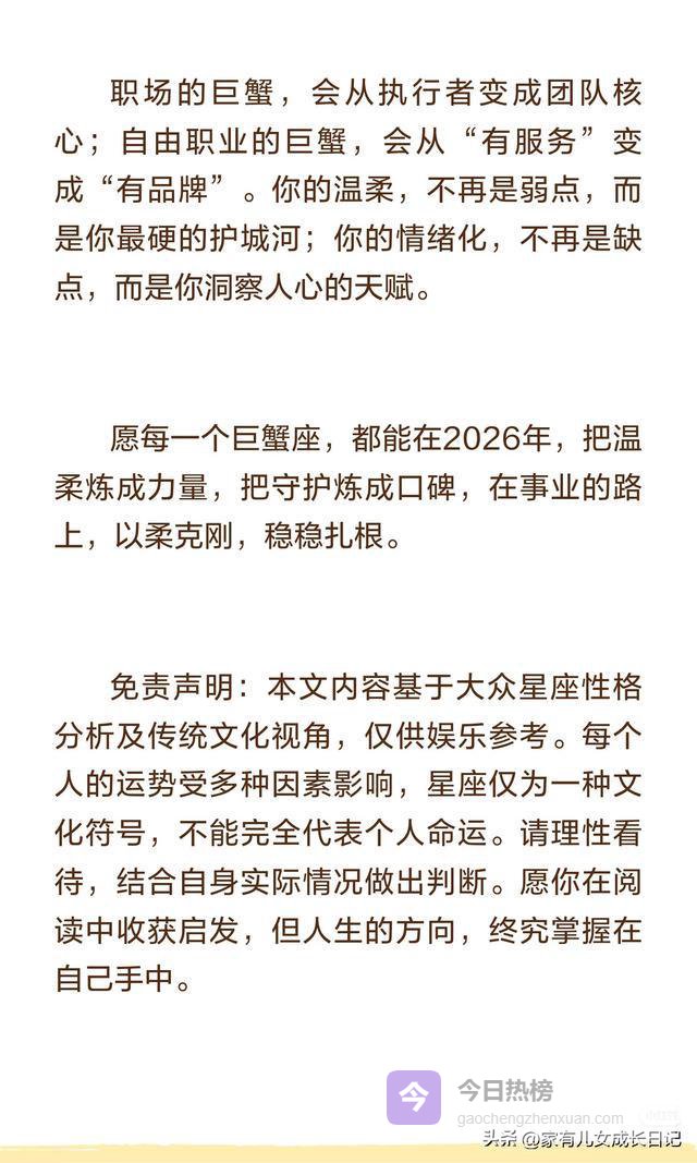 愿每一个巨蟹座,都能在2026年,把温柔炼成力量,把守护炼成口碑,在事业的路上,以柔克刚,稳稳扎根。