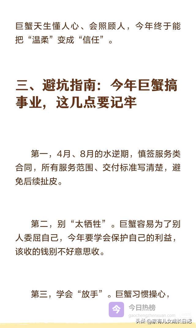 第三,学会“放手”:巨蟹习惯操心,但今年必须学会信任团队,别什么事都自己扛。