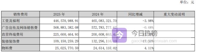 年报显示,2025年公司销售费用虽同比微降2.35%,但绝对值仍高达14.26亿元,其中广告宣传及网络销售费达5.69亿元,直营终端费用2.26亿元,而研发费用6832万元,销售费用是研发费用的近21倍。另外,公司的管理费用同比大增25.73%至2.44亿元,主要受工资福利及中介费用增加影响。再叠加1.24亿元的资产减值损失,多重成本压力共同侵蚀了公司的盈利空间。