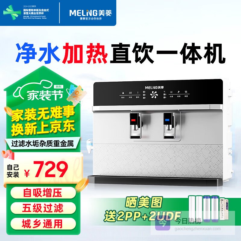 这款美菱净水器加热直饮一体机,采用RO反渗透五级精滤技术,有效去除水中杂质和有害物质,保障您和家人健康饮水。其五级过滤系统包括:高密度PP棉拦截泥沙等大颗粒杂质,UDF活性炭高效吸附余氯、异色异味和铁锈,RO反渗透膜去除大肠杆菌、重金属等有害物质,确保水质纯净。快速加热功能,使热水输出更加迅速,满足您全家热饮需求。