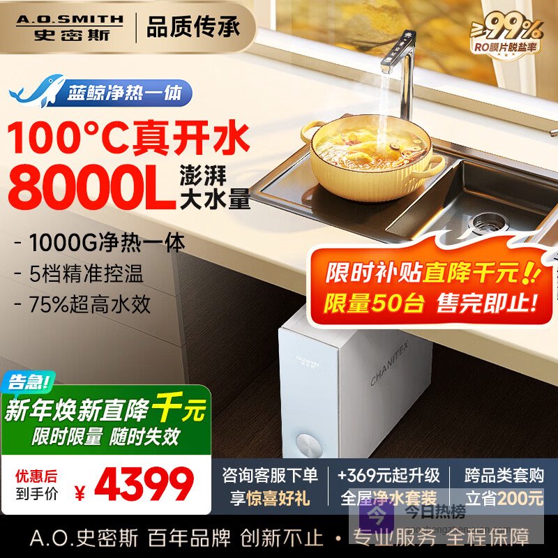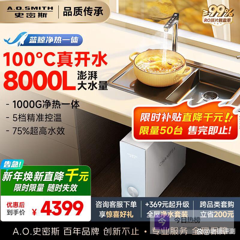史密斯(A.O.SMITH)佳尼特净水器家用加热直饮一体厨下净水机净饮机蓝鲸净热一体Pro CDR2500S1 1000G净热一体 3L/min母婴级净水¥