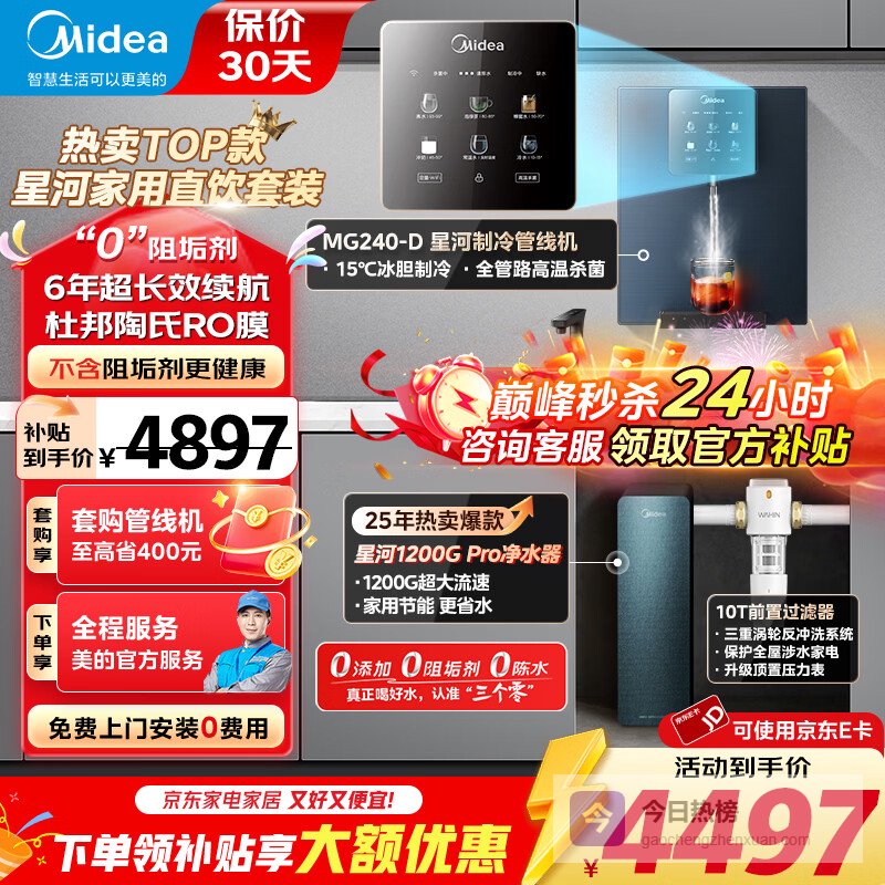 美的星河1200G PRO净水器套装,豪华顶配,性价比高。全国可领补贴,下单即享优惠。选择这款净水器,就是选择健康,选择品质生活。让您的家人喝上放心水,尽享美好生活。