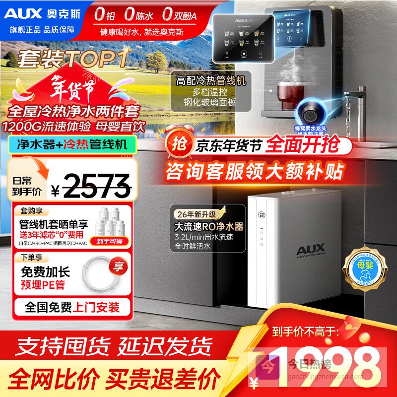 奥克斯(AUX)净水器母婴家用1200G流速0阻垢加热直饮一体机餐边柜壁挂式管线机厨下RO反渗透前置过滤全屋套装 【性能冷热款】一级水效净水器 管线机¥