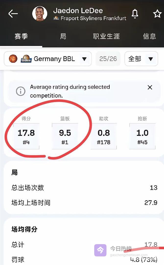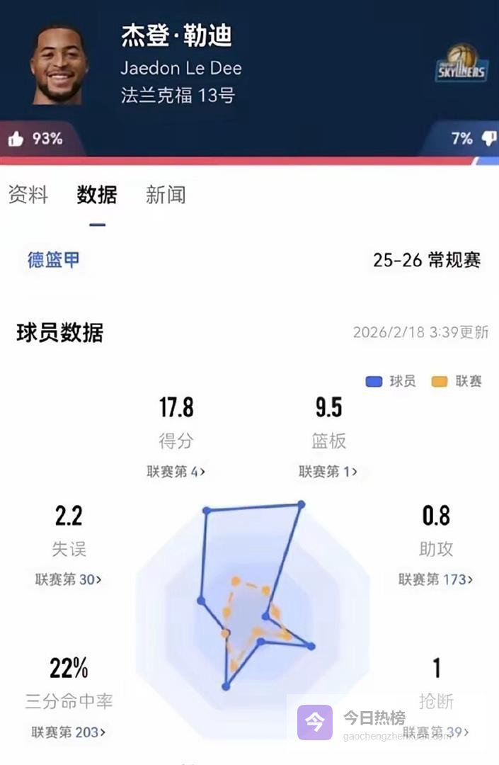 杰登·勒迪这个名字,可能很多球迷还不太熟悉。 但翻翻他在德甲的数据,就知道辽宁这次签下的绝对不是凑数的。 这名球员出生于1999年,今年26岁,正值当打之年,身高206厘米,场上主打大前锋和中锋两个位置。 在德甲法兰克福队效力期间,他场均出场28分钟,能贡献18.7分和10.1个篮板的两双数据。 要知道,德甲联赛的对抗强度和防守质量可不低,能在那种环境下场均砍下接近20+10的内线,放在CBA绝对够用。
